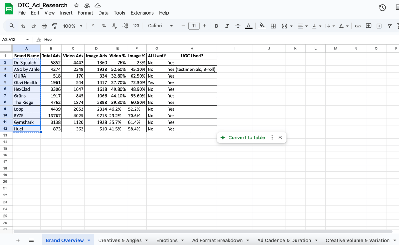 I looked at the paid ads from 11 nine and ten-figure DTC brands, analyzed over 40,000 creatives—across different angles, emotional appeals, and persona types —to uncover what actually works. We spent 40+ hours making into this report to know what’s working for DTC brands.