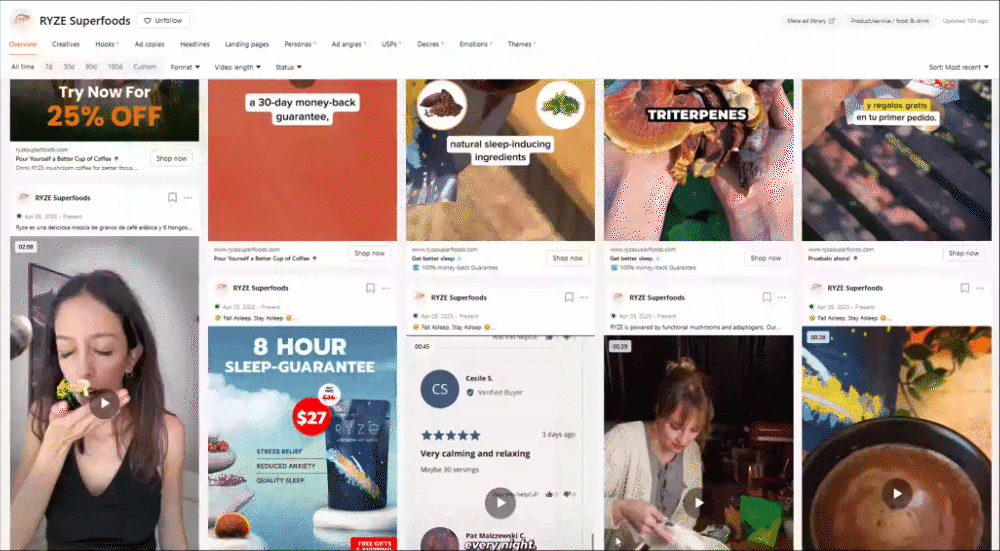 Strategy: Frequent hook refreshes, real testimonials, strong comparison to coffee