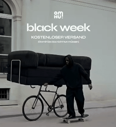 A sofa on a bicycle feels wrong, so attention spikes. Minimalism + absurdity makes the message more memorable than explanation.
