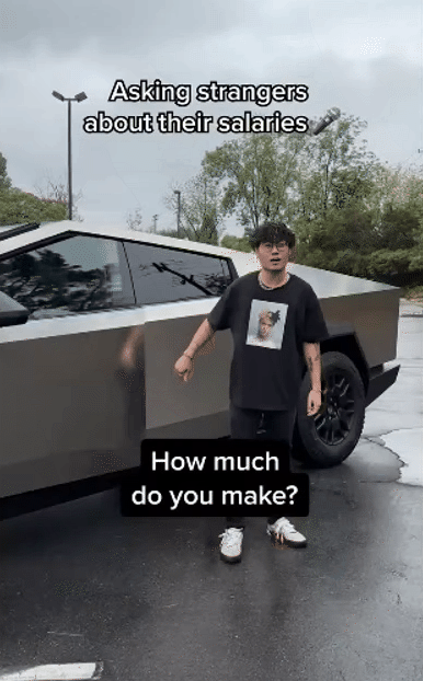 A guy stepping out of a Tesla Cybertruck. That one frame instantly signals money and status (or that you're a weirdo 😂), even before the text appears.