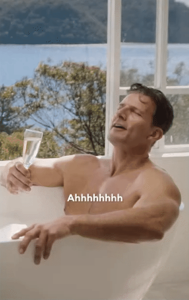 A shirtless guy, a bathtub, champagne, a view. The first frame does one thing: it makes you feel like you're looking at someone living better than you.